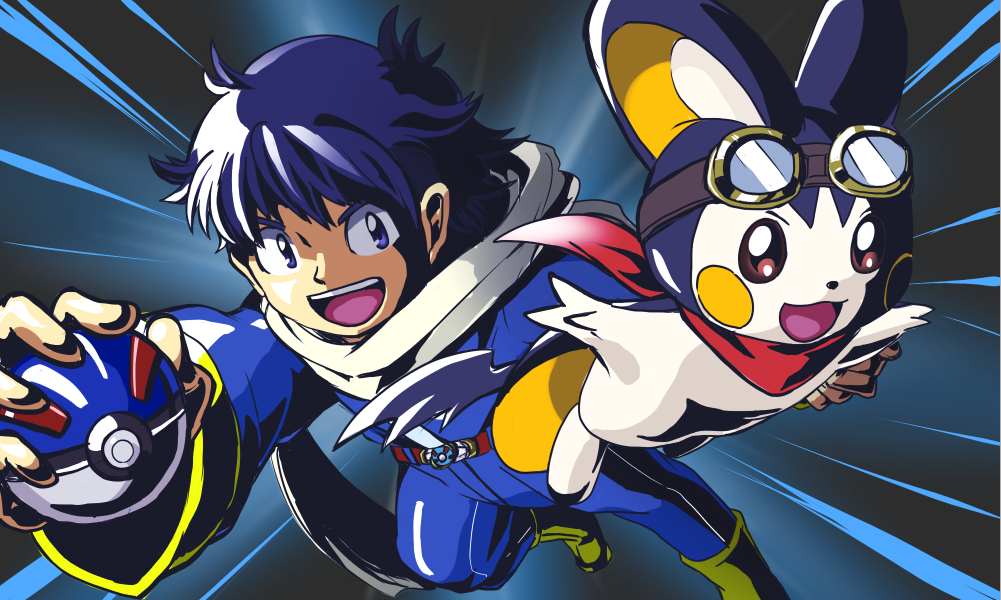 ヒーローごっこな姿のトレーナーなかやんさんと、ゴーグルスカーフがかっこいいエモンガのトビマルくん。