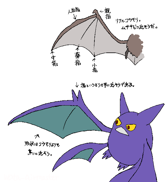 リアルなコウモリの翼はムササビとかに近い気がします。体の一部を引き伸ばしてるっていうか。哺乳類同士だし、ありえる話だと思います、きっと。…今日のところはコウモリについてはライトすぎる知識しかないです。